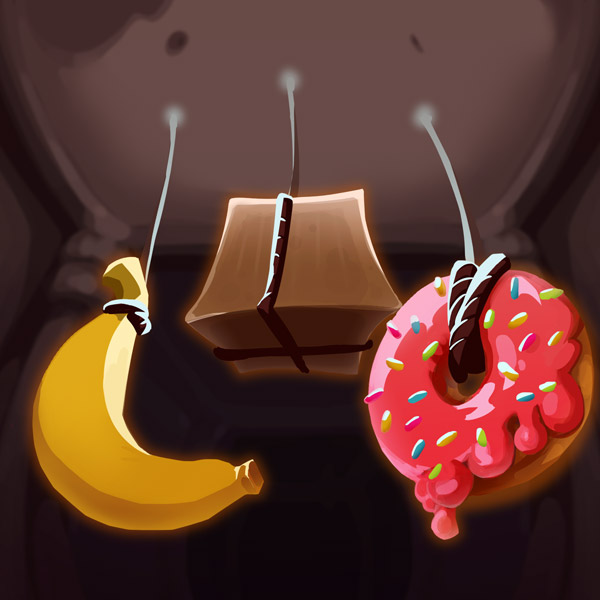 As you make your way down a long corridor you see a banana, a donut, and a box floating about. No... upon closer inspection they are tied to strings coming from holes in the ceiling. There is a quiet cackling from above as you approach the objects.