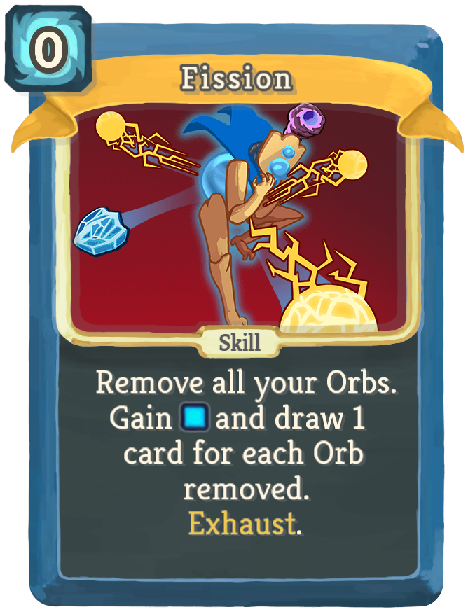 Fission is a Rare Skill for The Defect. It removes all Orbs, granting the player 1 Energy and drawing 1 card for each Orb removed this way. When Upgraded, it Evokes the Orbs instead of simply removing them--the difference is that the Orbs triggers their effects. Fission Exhausts on use.