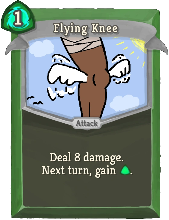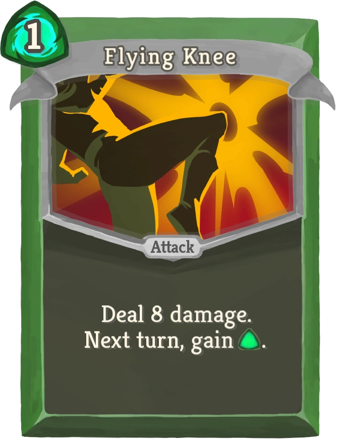 Flying Knee is a common Attack card for The Silent. It deals damage to a single enemy and causes 1 extra Energy to be generated at the start of the player's next turn. Upgrading it increases the damage it deals by 3.