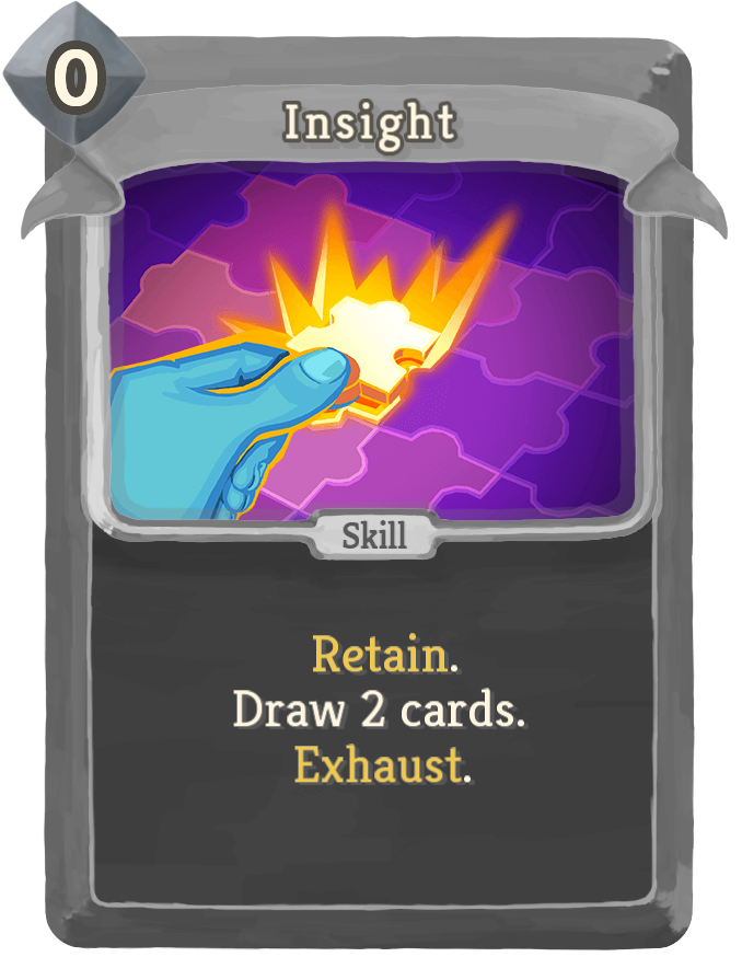 Insight is a 0-cost card for the Watcher. It cannot be obtained by itself; instead, Insights are added to your hand by other cards.
