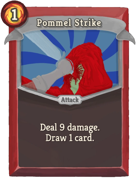 Pommel Strike is an Attack card for the Ironclad. It deals 9 damage, then draws 1 card. When Upgraded, it instead deals 10 damage and draws 2 cards.