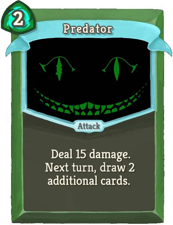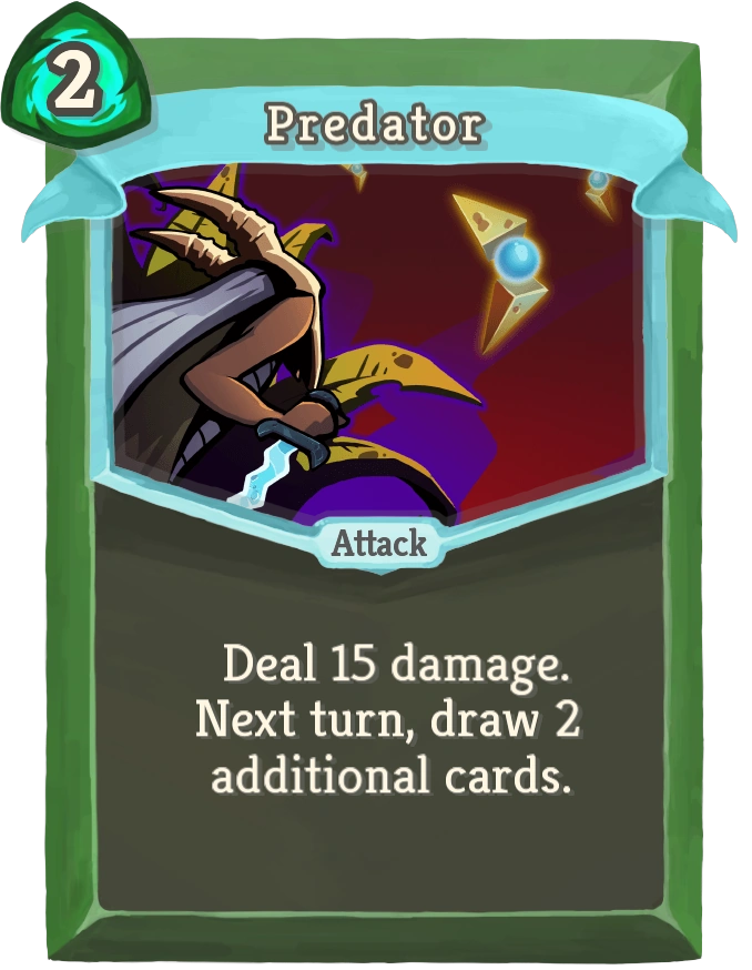Predator is an Uncommon Attack for The Silent. It deals a decent amount of damage for 2 Energy and draws 2 cards on the next turn.